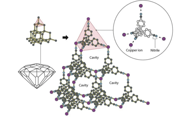 Fot. Richard Robson zainspirował się strukturą diamentu, w którym każdy atom węgla jest połączony z czterema innymi, tworząc piramidę. Zamiast węgla użył jonów miedzi i cząsteczki o czterech ramionach, z których każde zakończone jest nitrylem. Źródło: Johan Jarnestad/Królewska Szwedzka Akademia Nauk
