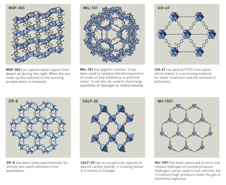 Fot. MOF-303 może wychwytywać parę wodną z pustynnego powietrza w nocy – gdy słońce nagrzeje materiał rano, uwalniana jest woda pitna. MIL-101 ma gigantyczne komory – był używany do katalizy rozkładu ropy naftowej i antybiotyków w zanieczyszczonej wodzie, może być również stosowany do magazynowania dużych ilości wodoru lub dwutlenku węgla. UiO-67 może absorbować PFAS z wody, co czyni go obiecującym materiałem do uzdatniania wody i usuwania zanieczyszczeń. ZIF-8 stosowano eksperymentalnie do wydobywania pierwiastków ziem rzadkich ze ścieków. CALF-20 ma wyjątkową zdolność pochłaniania dwutlenku węgla – jest testowany w fabryce w Kanadzie. NU-1501 został zoptymalizowany pod kątem magazynowania i uwalniania wodoru pod normalnym ciśnieniem – wodór może być używany do zasilania pojazdów, ale w zwykłych zbiornikach wysokociśnieniowych gaz ten jest niezwykle wybuchowy. Źródło: Johan Jarnestad/Królewska Szwedzka Akademia Nauk