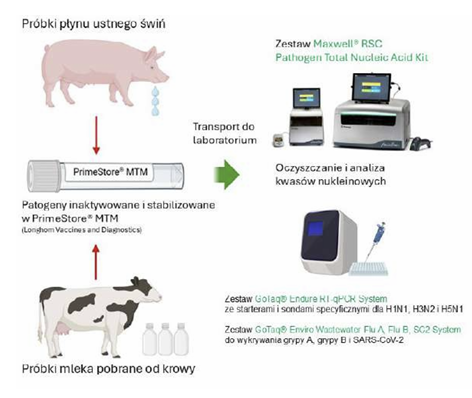 W odpowiedzi na te wyzwania Promega, we współpracy z Longhorn Vaccines and Diagnostics, opracowała kompleksowy protokół typu collection-to-detection, zaprojektowany z myślą o zastosowaniach w kontekście One Health (Fot. 4). [1, 2] Pierwszym krokiem jest pobranie i zabezpieczenie próbek. Stosuje się do tego specjalne medium transportowe PrimeStore® Molecular Transport Medium (MTM), które inaktywuje patogeny oraz stabilizuje kwasy nukleinowe. Dzięki temu materiał może być bezpiecznie transportowany do dalszej analizy, bez konieczności utrzymywania łańcucha chłodniczego. Kolejnym etapem jest automatyczna izolacja kwasów nukleinowych z wykorzystaniem systemów Maxwell® RSC oraz zestawu Pathogen Total Nucleic Acid Kit. Automatyzacja tego procesu minimalizuje ryzyko błędów użytkownika i zapewnia powtarzalność wyników, nawet w przypadku trudnych matryc biologicznych, takich jak mleko krowie czy płyn ustny świń. Ostatnim elementem metody jest detekcja molekularna metodą RT-qPCR z użyciem zestawów GoTaq®, które charakteryzują się wysoką czułością i kompatybilnością z powszechnie stosowanymi starterami i sondami dla wirusów grypy typu A.