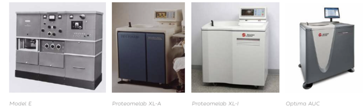 Historia rozwoju instrumentu obejmuje kilka etapów, prawdziwych kamieni milowych. Pierwszy komercyjnie dostępny instrument Model E, opracowany w roku 1947, pomimo że znacznie mniejszy od oryginalnej wirówki Svedberga (zajmowała ona dwa piętra w budynku!), nadal przypominał ogromną szafę i był stosunkowo trudny w obsłudze, co odstraszało potencjalnych użytkowników. Prawdziwym przełomem było wprowadzenie na rynek przez firmę Beckman, odpowiednio w roku 1992 i 1996, modeli Proteomelab XL-A i XL-I. Osiągnęły one wymiar standardowej wirówki preparatywnej i wyposażone były w komputerowy układ akwizycji danych, możliwość precyzyjnej regulacji szybkości rotora oraz temperatury. Dodatkowo model XL-I pozwalał na zbieranie danych nie tylko z wykorzystaniem absorbancji, ale także interferencji. Następnym udoskonaleniem była możliwość zastosowania fluorescencyjnego systemu detekcji (modyfikacja T. Laue), co znacznie poszerzyło możliwości wirówki i zwiększyło jej selektywność i czułość. W roku 2017 Beckman-Coulter zaprezentował Optimę AUC – najbardziej zaawansowany technologicznie model wirówki. W stosunku do poprzednich instrumentów znacznie zwiększono rozdzielczość pomiaru, poprawiono stosunek sygnału do szumu, 11 x zwiększono rozdzielczość optyki interferencyjnej oraz poprzez umożliwienie jednoczesnej detekcji sygnału w 20 różnych długościach fali zwiększono precyzję pomiaru złożonych kompleksów. Wszystko to w znacznie krótszym czasie niż w przypadku poprzednich modeli.