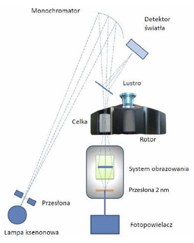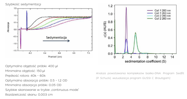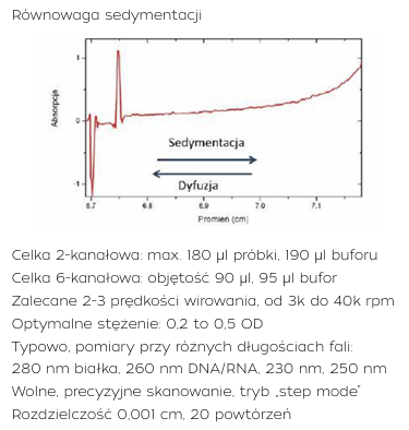 Wirówka analityczna, dzięki zainstalowanym układom optycznym, pozwala na dynamiczne śledzenie zmian rozkładu stężeń roztworu badanej próbki umieszczonej w celce pomiarowej. Doświadczenie odbywa się w ściśle kontrolowanych warunkach, w precyzyjnie wyznaczonej temperaturze oraz przy określonej szybkości kątowej rotora. Wirówka XL-I może dysponować trzema systemami detekcji: absorpcyjnym UV/VIS, interferencyjnym oraz fluorescencyjnym. Analizowana próbka umieszczona jest w rotorze tytanowym i może być wirowana z prędkościami w zakresie od 1 000 do 60 000 obrotów na minutę, co pozwala na analizę obiektów o masie od 1000 Da do 1 500 000 Da – czyli od peptydów i fragmentów kwasów nukleinowych do złożonych kompleksów makrocząsteczek czy wirusów.