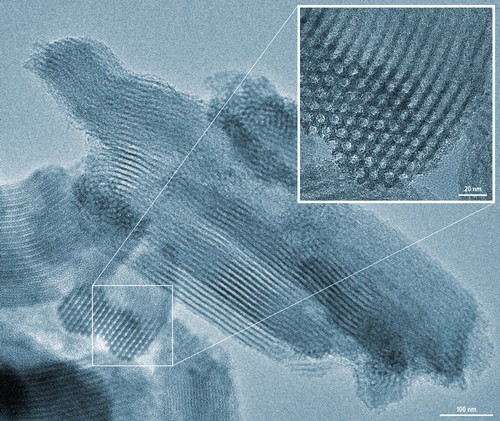 Fot. Budowa materiału B-STING – krzemionkowy szkielet z graniastosłupów (po lewej) zawiera równoległe rurki (środek) pokryte od wewnątrz grupami funkcyjnymi z pojedynczymi atomami miedzi (po prawej), źródło: IFJ PAN